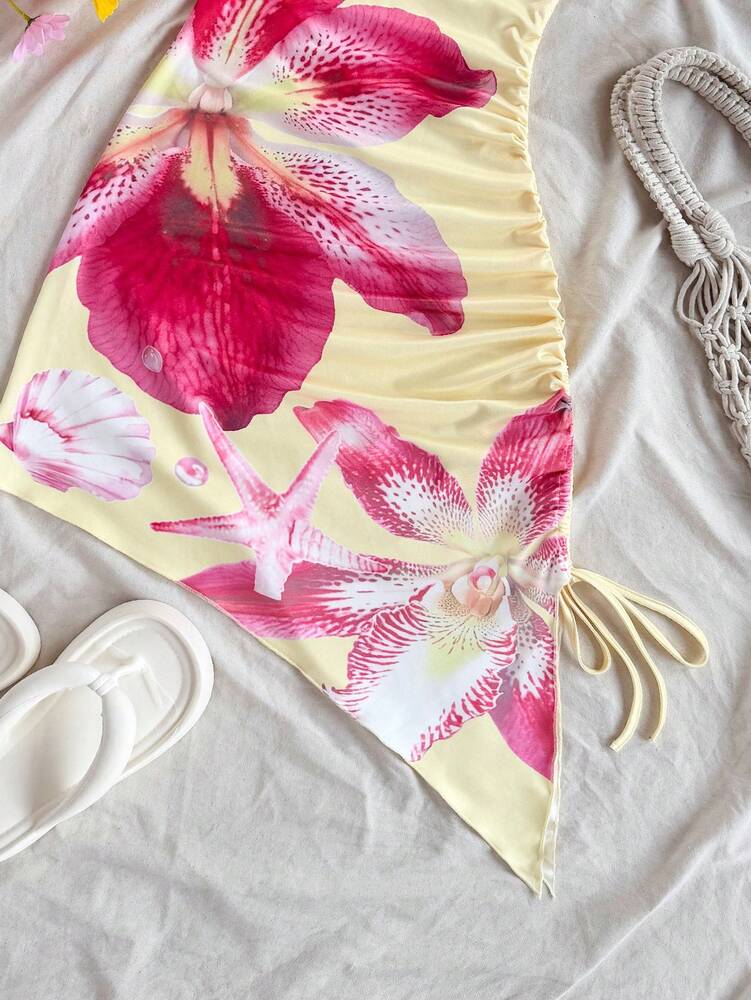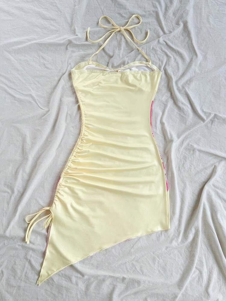 This women's floral halter neck dress features a slim fit with a natural mid waist and asymmetrical hem, perfect for beach outings and Easter festivals. Crafted from a medium-stretch knitted fabric blend of polyester and elastane, it offers comfort and flexibility. The sleeveless, unlined design highlights the boho style with ruched and knotted details, combined with vibrant tropical and graphic prints. Easy to care for with machine wash instructions, this short dress balances elegance and casual charm for your summer wardrobe.