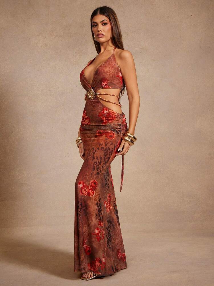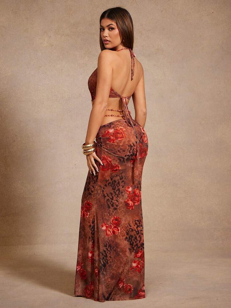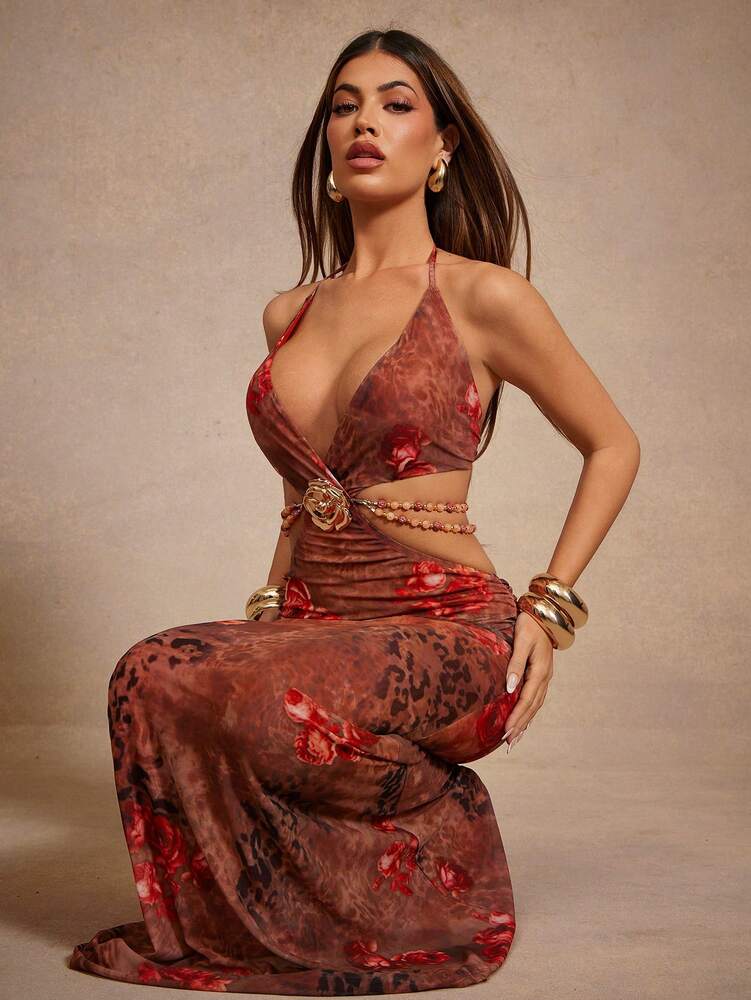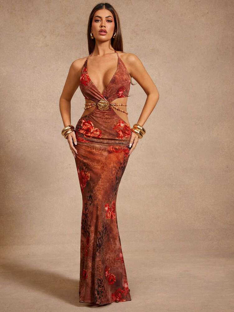 This sleeveless bodycon dress features a halter neckline and a high waist pencil hem, designed for stage and concert occasions. Made from medium-stretch mesh fabric with a floral all-over print, it offers a backless cut-out detail with a knot accent for a flattering, sexy silhouette. Fully lined for comfort, the dress combines 94% polyester and 6% elastane for durability and fit. Its long length and regular fit make it suitable for festive events like Ramadan and Eid. Easy care instructions allow machine washing with soft detergent, ensuring longevity and style throughout the season.